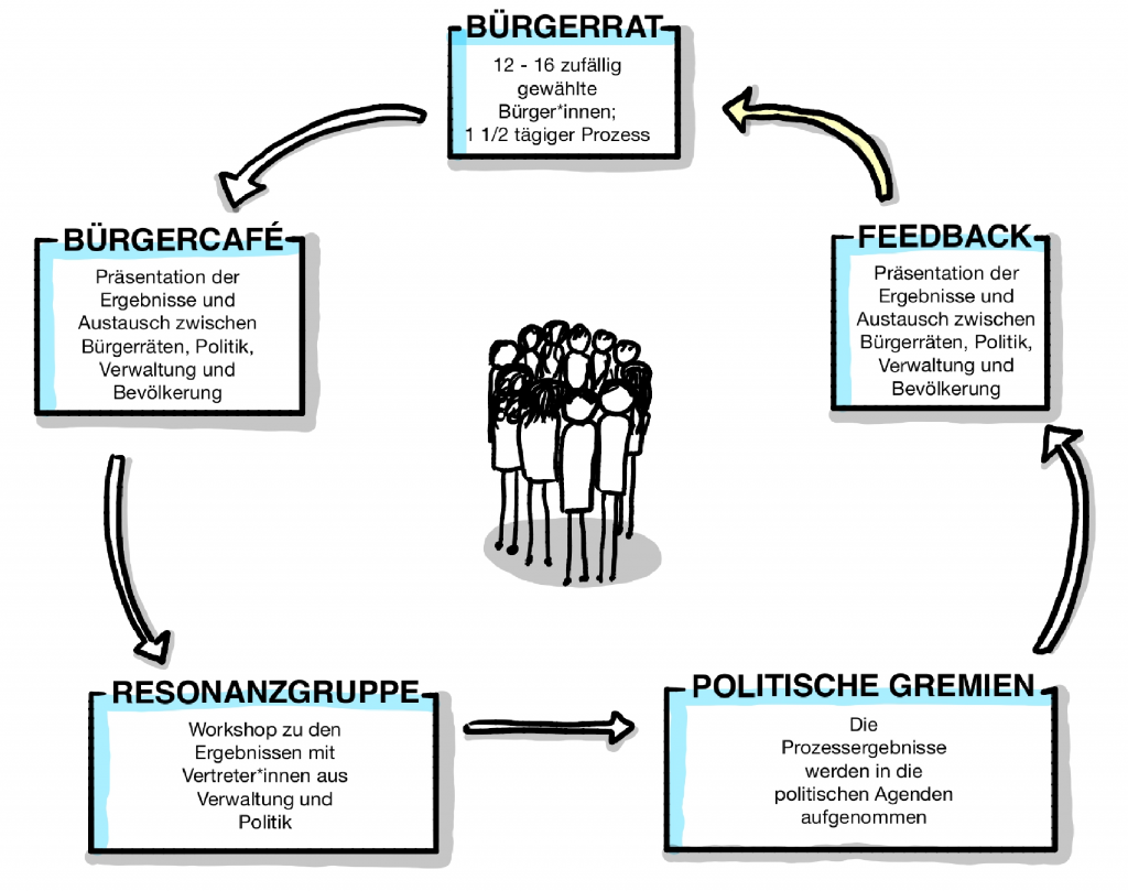 Citizens of a town or region are randomly selected from the register of residents. They are to work together for one and a half days on a joint declaration. To ensure that the make-up of the council reflects the area from which it is drawn, criteria such as age, gender and place of residence are taken into account in the selection process. Due to random selection, the participants are people with everyday knowledge who have no special knowledge nor previous qualifications. In particular, this means that they do not represent an interest group, but only their own opinions.